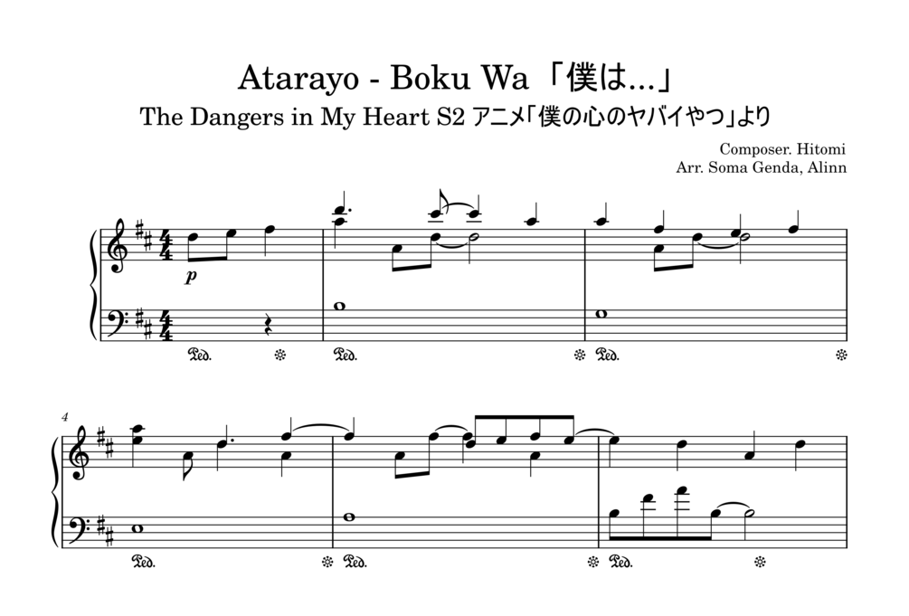 Atarayo - Boku Wa 「僕は...」- Piano Sheet Music$0+$0+https://schema.org/InStockusdAlin's PianoAlin's Piano1 ratingName a fair price:$I want this!52 downloadsSize103 KBLength5 pagesAdd to wishlist New wishlistShareShare on XShare on Facebook Copy linkCopy product URLRatings5(1 rating)155 stars100%4 stars0%3 stars0%2 stars0%1 star0%